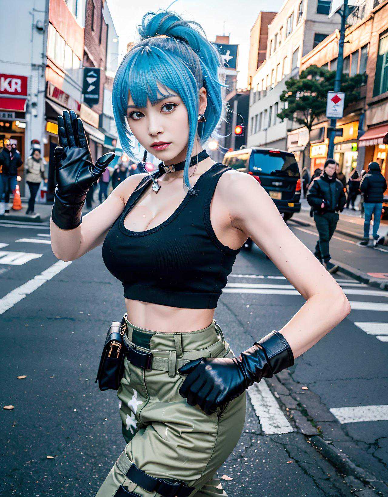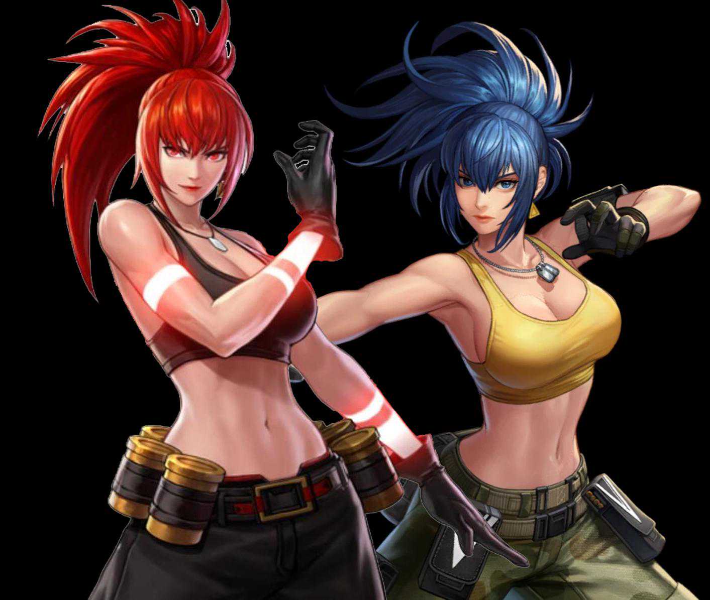 毕竟《拳皇12》当年并没有成为主流。蓝色的头发、黑色的背心、腰间配上了炸弹,高筒马丁鞋配上军用长裤,看上去英姿飒爽又不失女人味。