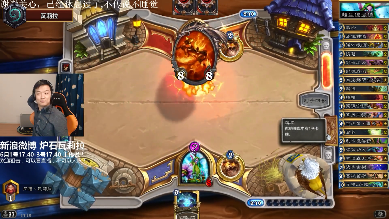 因为有了线下对战的影响,之后自然而然的成为了瓦娘的粉丝。每天下班之后,就开开心心的看着瓦娘的直播,一直到了现在,前一段时间,好多主播都宣布放弃炉石,心里想着还有我瓦就好,没想到突然之间就要暂停直播了。大家也知道,瓦娘有各种比如:素材瓦,护国瓦等等的称号,我们就来回忆一下那个伴随我们4年的瓦娘吧。