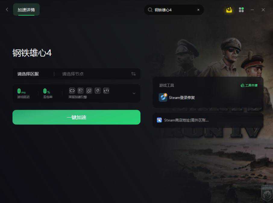 首先我们需要打开奇游选择一个美服节点进行加速,这样我们就可以轻松访问到《钢铁雄心4》的购买页面。如果在加速过程中遇到“地区不可用”的提示,不要慌张可以尝试更换节点或者加速Steam美测服节点,然后刷新页面。