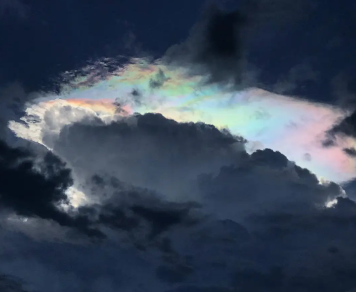 幞状云内因为高度足够高,在冻结层以上,这里的水汽以过冷水或者小冰晶的形式存在,在合适的太阳角度之下,就会形成虹彩。