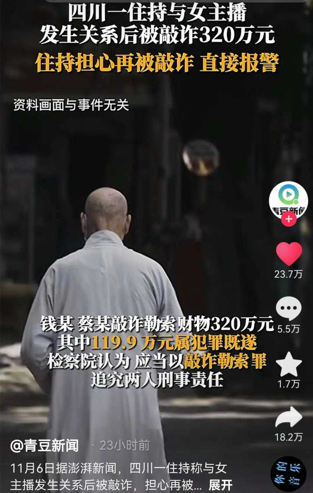 今天要说的,是一位寺庙主持与一位网络女主播之间的狗血故事。简单地说,就是一个和尚动了凡心,爱上了一个美女主播。故事跌宕起伏,一波三折,先是风花雪月,你侬我侬,然后演变成爱恨情仇、两败俱伤的闹剧。