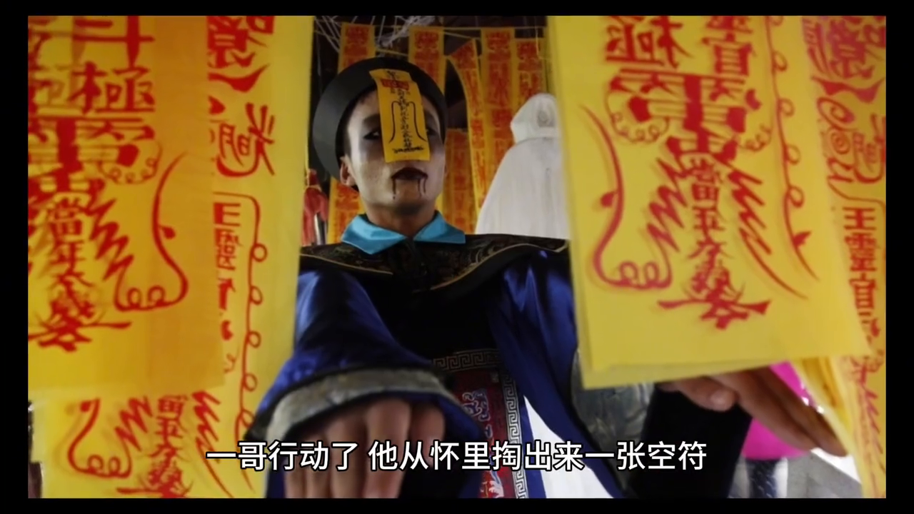 纸人跟我在梦里头看到的一模一样,苍白的脸上涂着油彩青的青红的红,两边的腮红看起来极度的骇人。看样子应该是个打锣的,手里持着一面铜锣,张望着院子里,视线左右瞄来瞄去我和一哥大气也不敢喘,两个人跟两只鸭子一样站在原地。纸人的视线在寻不到目标以后才慢慢的把狗头缩了回去,一蹦一蹦的看起来很欢快的走掉了。而它的身后大红的轿顶从院墙外头露出一半,这一夜幽魂开道新娘出巡。等到戏班的声音远去以后,耳边那几声"三郎"着实是听的真切,我和一哥差一点就经历了一番的生死,浑身是汗的大字型躺在地上,"混过去了?"我摸着还在扑通扑通的心脏真几把吓人,空明符起作用了。不然这老东西可不是一般的游魂野鬼,怎么就跑下山了?