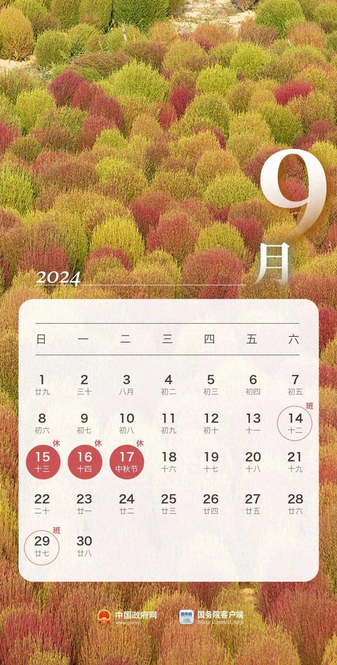 六、中秋节:9月15日至17日放假调休,共3天。9月14日(星期六)上班。